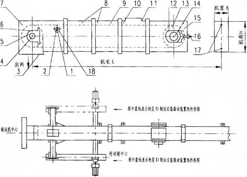 鏈式輸送機的驅動裝置采用XWD型行星擺線針輪減速機。輸送機的長度L以0.5米為一檔。FU150、200、270型輸送機的標準中間節長度為2米;非標準中間節長度為1.5米、1米。FU350型的標準中間節長度為3米;非標準中間節長度為2.5米、2米、1.5米。工藝布置時可選用數節標準中間節與數節非標準中間節組合成需要的機長L,并盡可能選用標準節組合。