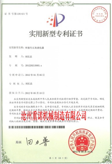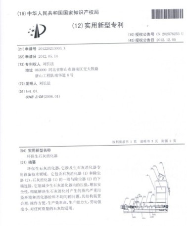 環(huán)保型生石灰消化器專利是我公司工程師劉工在2012年1月5日正式提交專利,在2012年5月10日正式獲得專利證書,目前環(huán)保型生石灰消化器已經(jīng)為我公司專利產(chǎn)品!